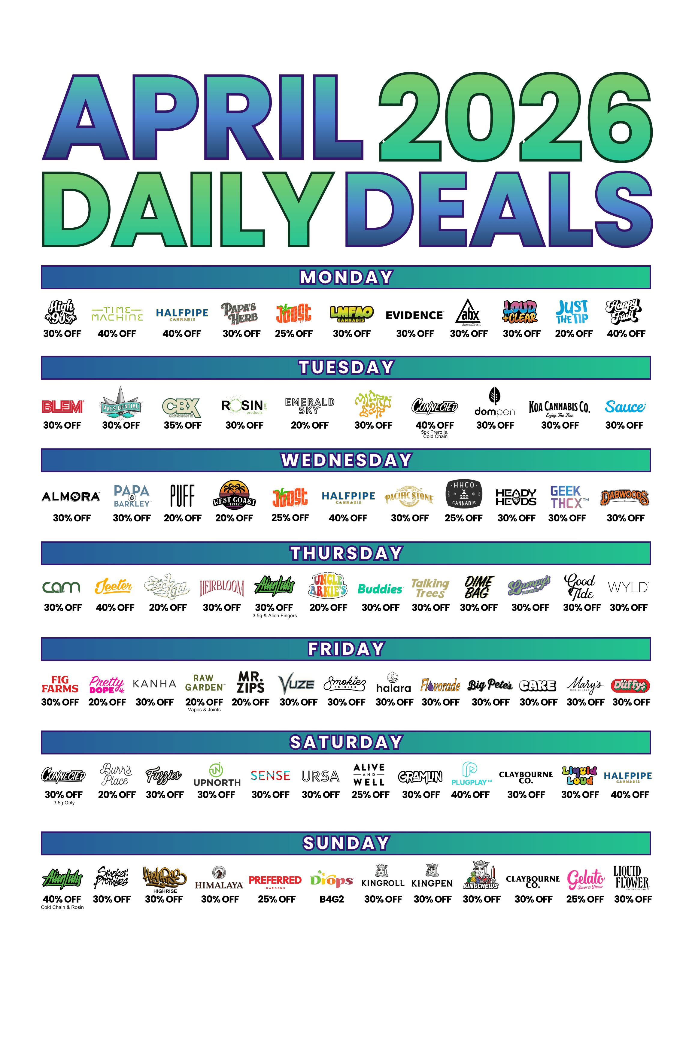 Discounts vary by location. Cannot be combined or stacked with other sales or Daily Special Discounts.