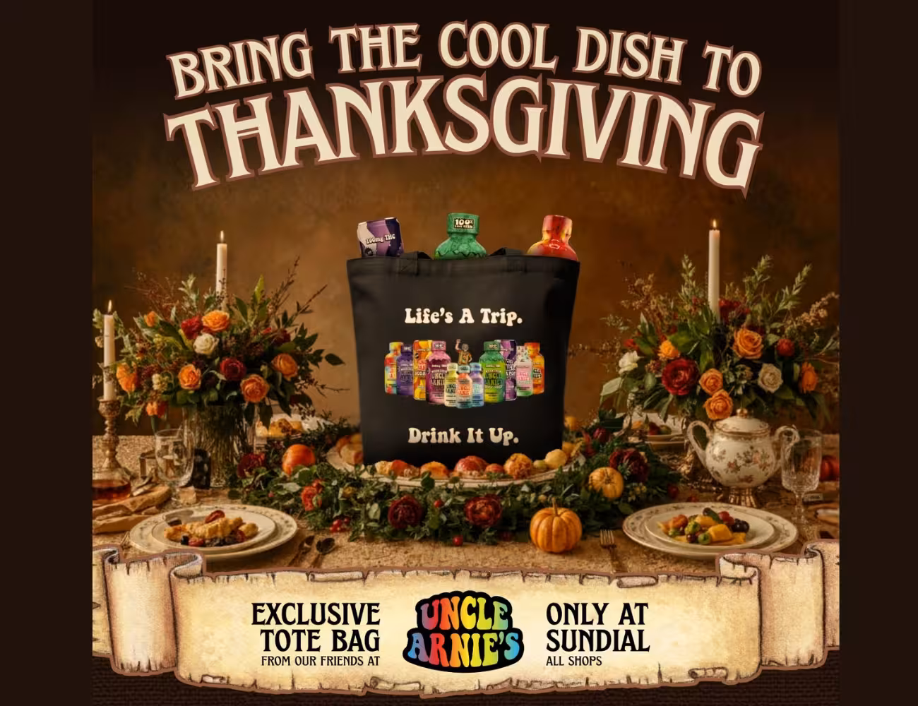 For just $49, you get a co-branded Uncle Arnies tote bag plus six THC beverages tucked inside. Yes…six. That’s a full lineup of vibey, feel-good drinks ready to elevate game nights, Friendsgiving hangouts, Sunday snack boards, and that moment when you finally sit down after hosting dinner.